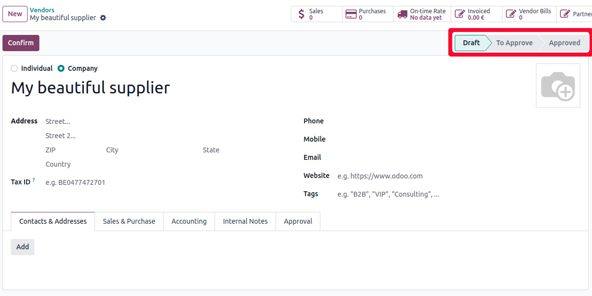 - Dans la vue du fournisseur, deux boutons permettent à tout utilisateur de faire passer le fournisseur à l'état "A approuver".