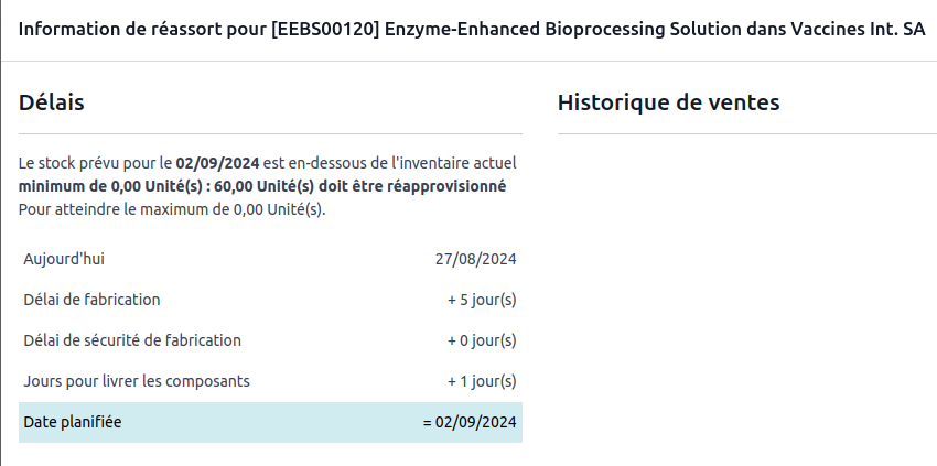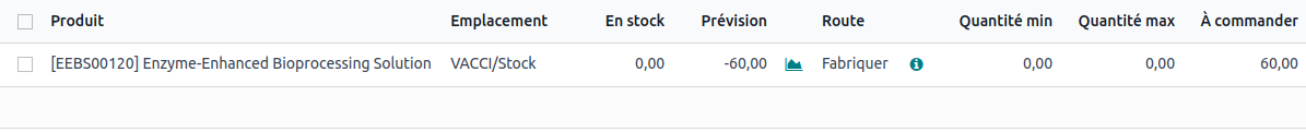 Par exemple, dans l'illustration ci-dessous, nous avons 5 unités en stock de l’article Enzyme-Enhanced Bioprocessing Solution. Deux livraisons sont prévues : l'une le 30/08 et l'autre le 02/09. La production de cet article nécessite 5 jours, mais aucune production n'est encore planifiée. Lors de l'accès au tableau de réassort, Odoo détecte un risque de retard de livraison et propose de générer un réapprovisionnement pour les 60 unités manquantes.