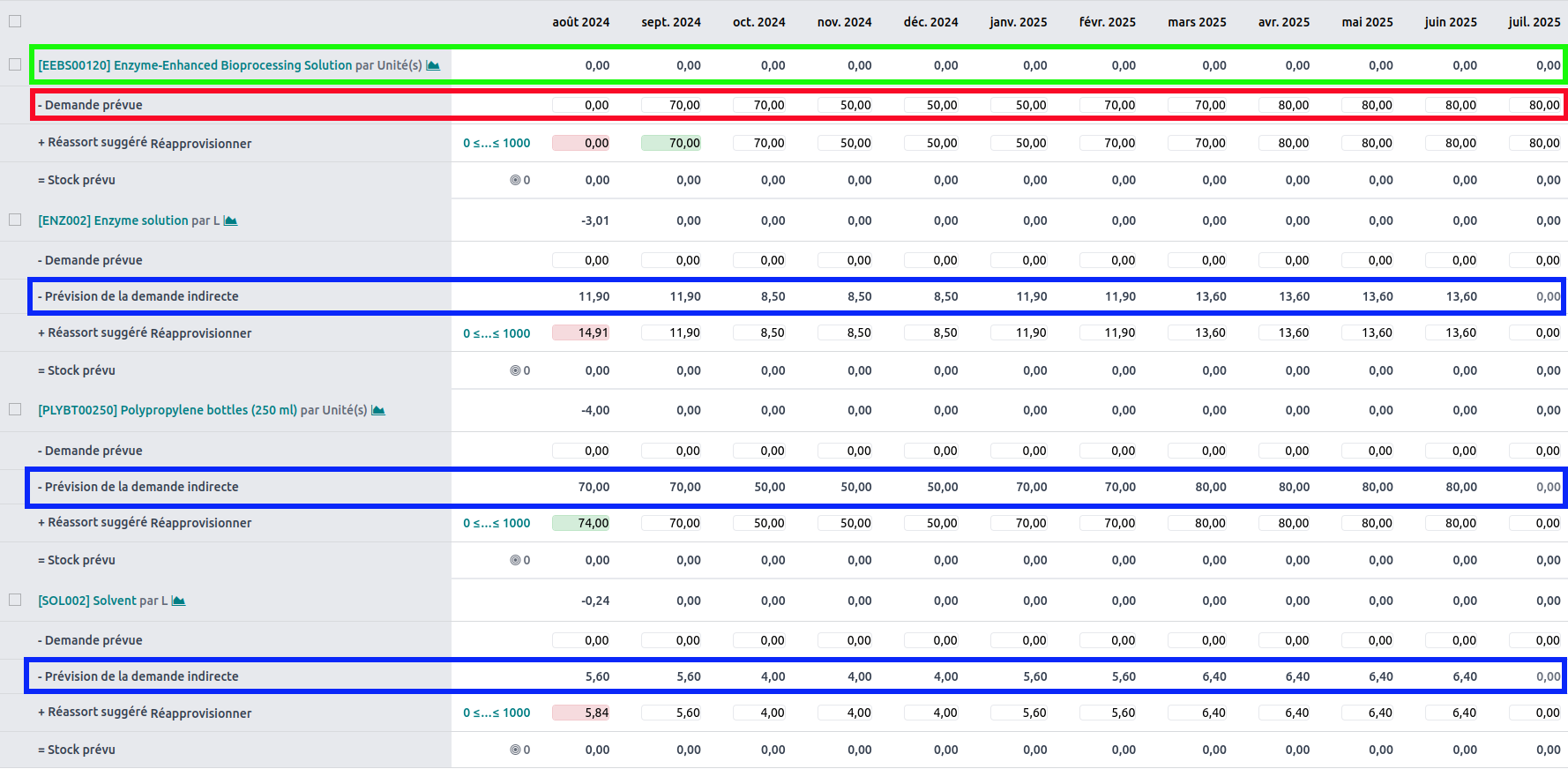 Odoo affiche sur la ligne verte l'état prévisionnel du stock au début de chaque période, basé sur les entrées et sorties déjà enregistrées dans le système. Sur la ligne rouge, j'ai manuellement saisi les demandes prévues pour l'article Enzyme-Enhanced Bioprocessing Solution.