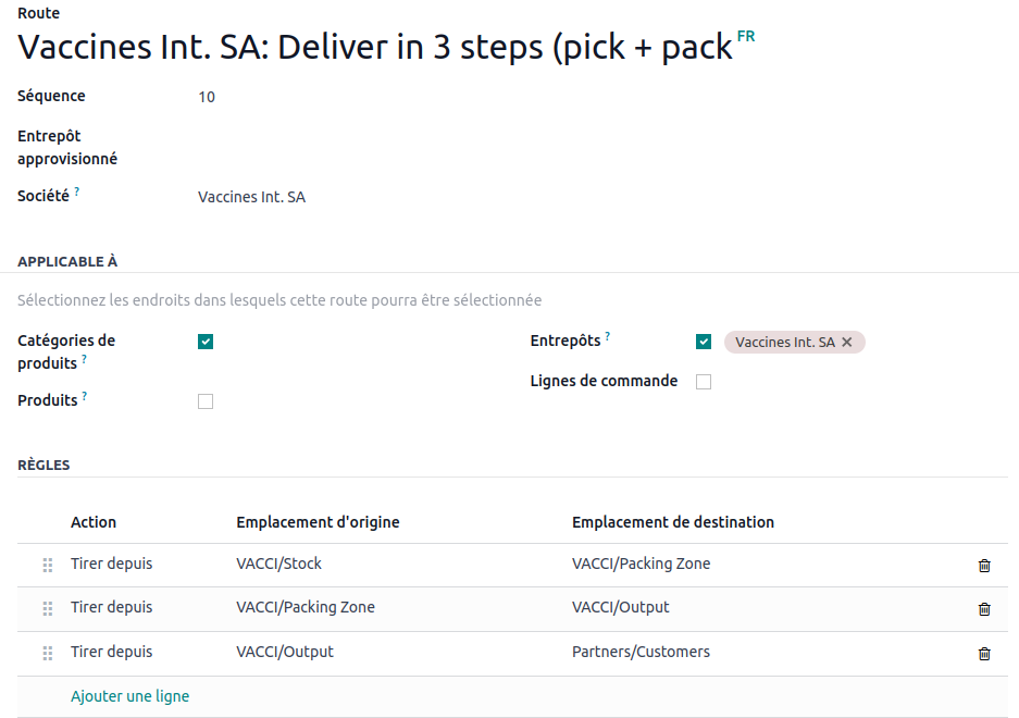 Dans cette exemple, nous avons une route logistique de livraison (Deliver in 3 steps) qui est composée de 3 règles: