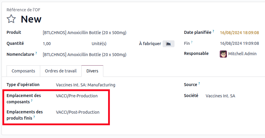 Un ordre de fabrication est lié à un emplacement source et un emplacement de destination, déclenchant un besoin en composants sur l'emplacement source et une réception du produit fini sur l'emplacement de destination.