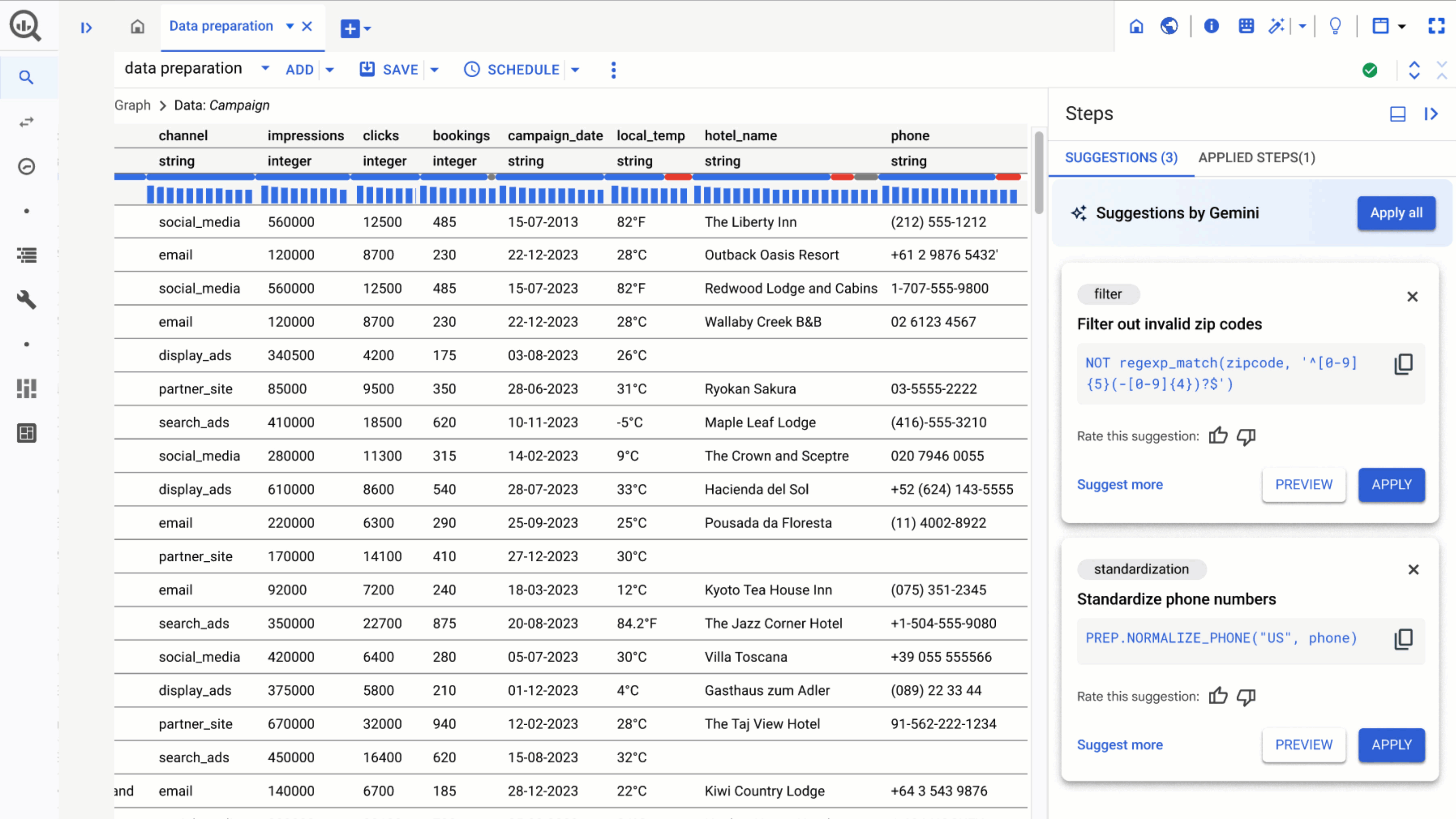 Google a également introduit un nouvel outil de préparation des données, basé sur son modèle d'IA Gemini. Avec de simples commandes écrites en prompt, il est désormais possible d’effectuer des manipulations sur les colonnes d’une table.