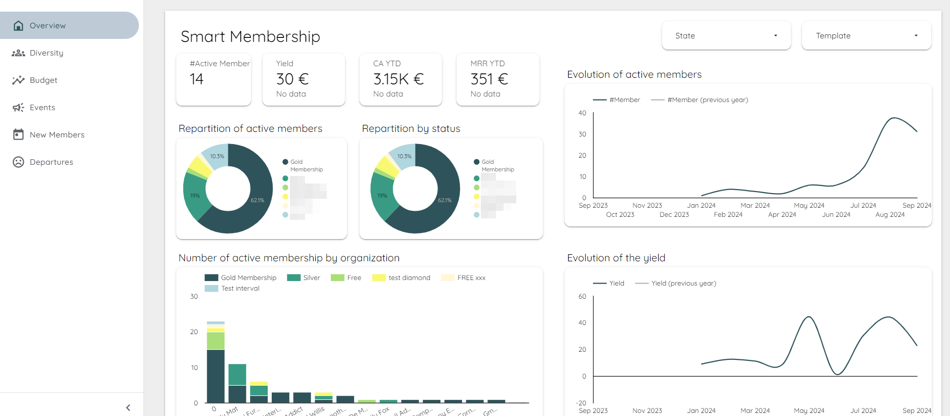 - Tableaux de bord Smart Analytics : Accédez à des tableaux de bord en temps réel pour suivre des indicateurs clés dans votre quotidien. Que ce soit des informations sur la diversité de vos membres, sur le succès vos cotisations ou encore sur la santé financière de votre organisation, ayez une vue complète et high-level de la situation, qu'elle soit passée, présente ou future. Notre équipe de Data Analysts sont capables d'ajouter les KPI que vous souhaitez, tels que le taux de rétention, le taux d'engagement, le Net Promoter Score (NPS), la Customer Lifetime Value (CLV) ou tout autre que vous jugerez pertinent.