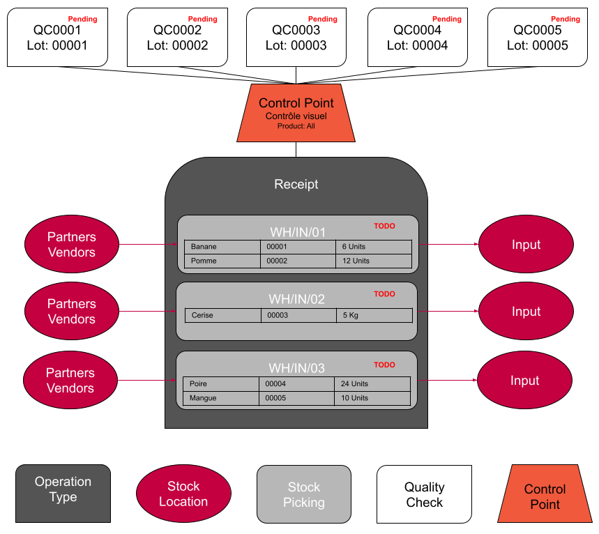 Dans Odoo, vous avez la possibilité de configurer des points de contrôle. Un point de contrôle surveille un type d'opération logistique et s'applique à une liste d'article.
