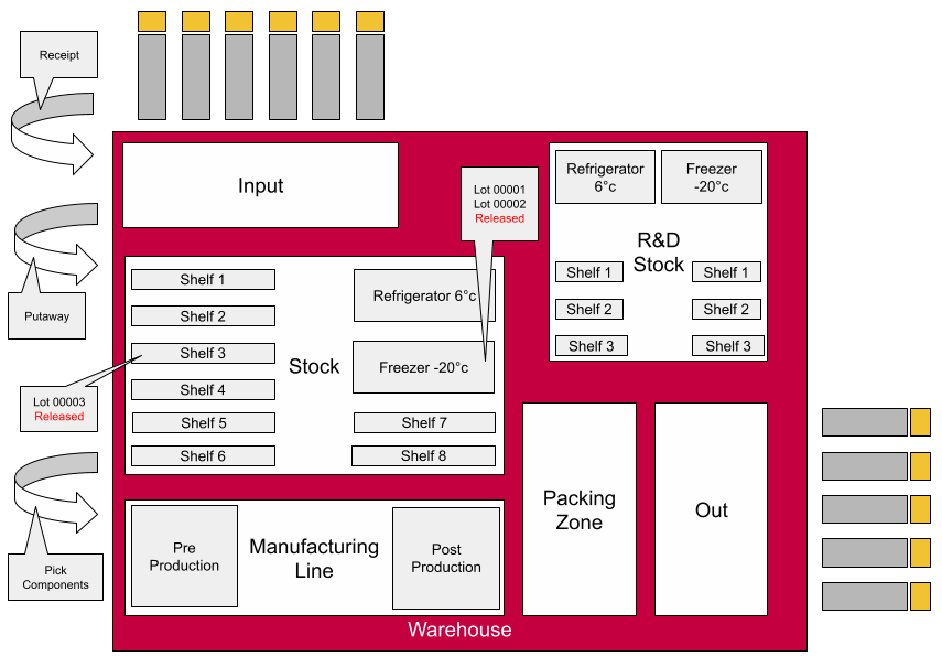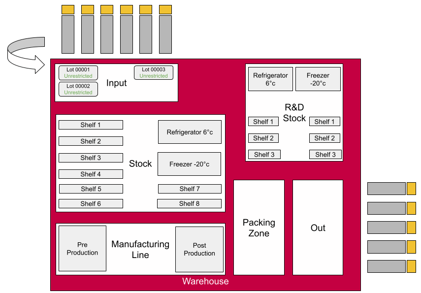 Cet entrepôt appartient à une société de production automobile elle a plusieurs types d'opération logistique dont des réceptions (Receipt), des mises en stock (Putaway), et des sélections de composants (Pick Components). La société achète des bobines de métal qui sont utilisées sur ses chaines de production. La qualité de ces bobines est contrôlée à deux moments différents, à la réception les dimensions sont contrôlées. Ensuite avant l'utilisation en production les propriétés de la bobine sont testés tel que la dureté et l'état de surface.