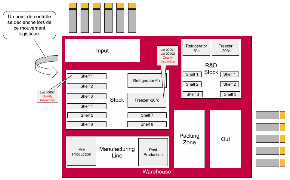 Deuxièmement, nous ne pouvons pas avoir deux contrôles qualité indépendant en cours au même moment. Prenons en exemple l'entrepôt suivant: