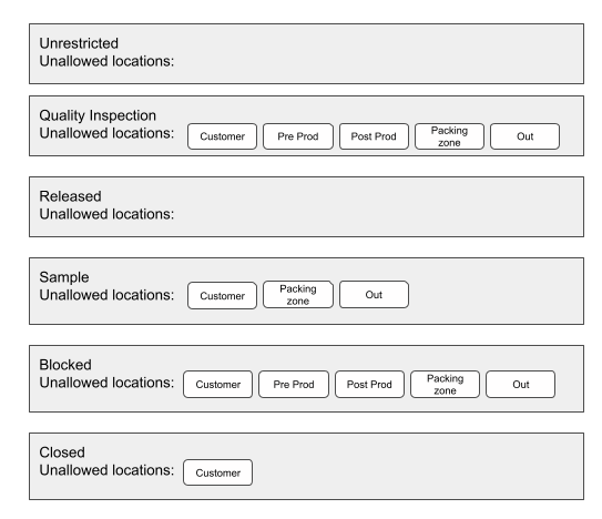 A chacun de ces statuts de lot nous pouvons associer une liste de zones non-autorisées. Voici un exemple de configuration qui pourrait être effectué.