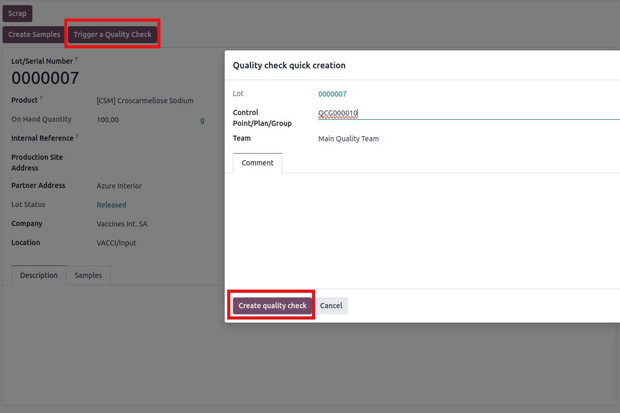 En validant la pop-up Odoo va générer les contrôle qualités lié au point de contrôle sélectionné. Ce qui va par la même occasion modifier le statut du lot en "Quality Inspection".