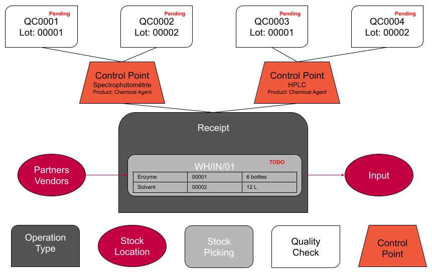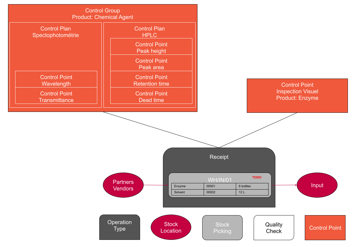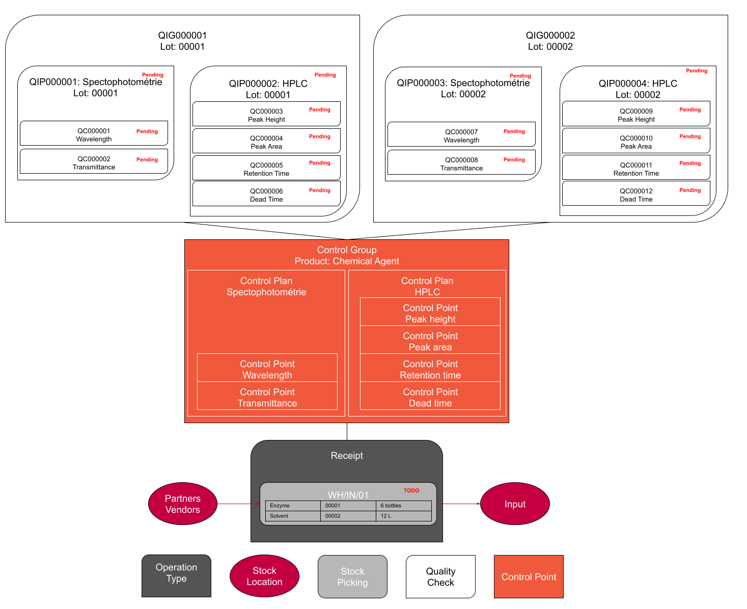 Nous avons deux points de contrôles qui surveillent tous les deux les réceptions et qui s'appliquent tous les deux aux agents chimiques. Nous réceptionnons un lot d'enzyme et un lot de solvent, les deux points de contrôle se déclenchent et créent chacun un contrôle qualité par lot.